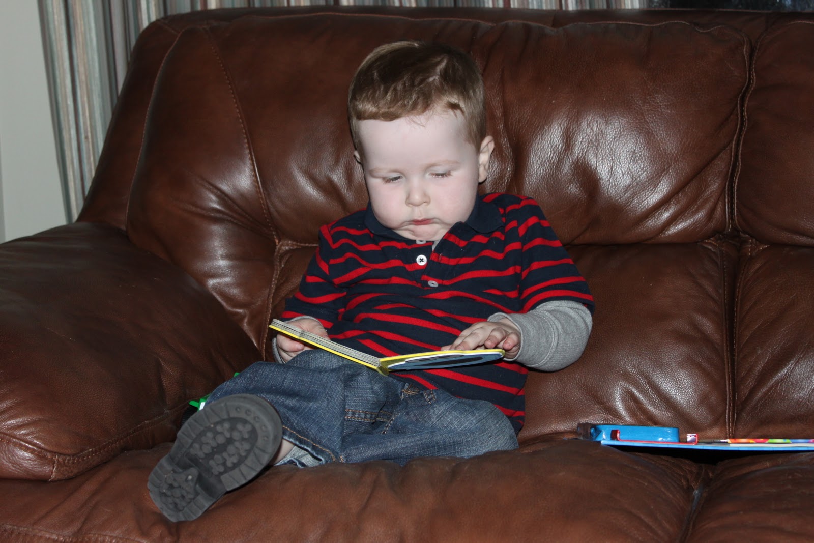 Yup, same pajamas as yesterday! I finally did change him out of them after we showered at 4pm. :) Zach has become totally obsessed with books over the last week. It doesn't matter if it is a picture book, word book, or even phone book...he just loves flipping through. Today he found this particular picture book hilarious. After turning every page he would laugh and laugh.