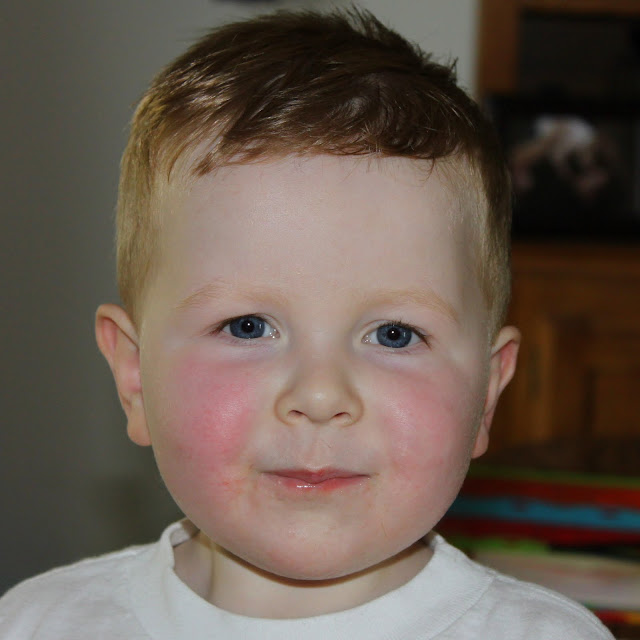 Zach and Chris finally got haircuts on Sunday. Here is my pink-cheeked boy showing off his new hairdo.