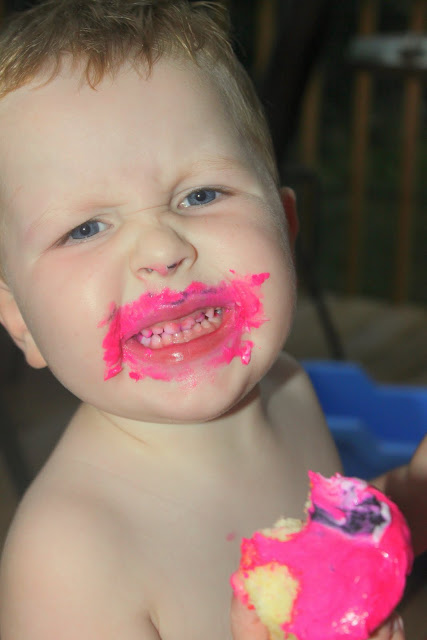 This morning Zach's first words when he woke up were "Me want cake!" To help oblige his sweet tooth, Mimi brought cupcakes over tonight!