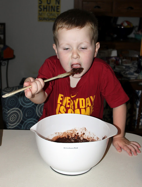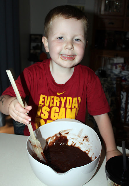 Friday afternoon I got off work around 2:30 to kick start the holiday weekend. I headed to Hy-Vee and blissfully shopped by myself for 45 minutes before I picked up Zach. When we got home, we starting preparing food for Saturday's tailgate. I made taco pasta salad, low carb BBQ pulled chicken, no carb buns, zucchini chips, and a cucumber & onion salad. Zach made brownies. He cracked the eggs, measured the water and oil (with a little help from me), and stirred them all by himself. He was SO proud of the brownies! He of course had to taste test the badder at least 5 times. He is his mama's boy!