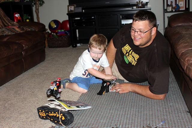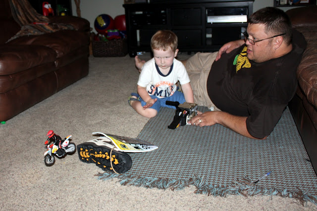 It amazes me how kids go through phases with toys. Zach will play with something everyday for 2 weeks, and then not again for 3 months. He recently began re-playing with a dirt bike toy you can launch across the room. Seeing my boys work together to create a jump while watching the Olympics made for a perfect Friday night!