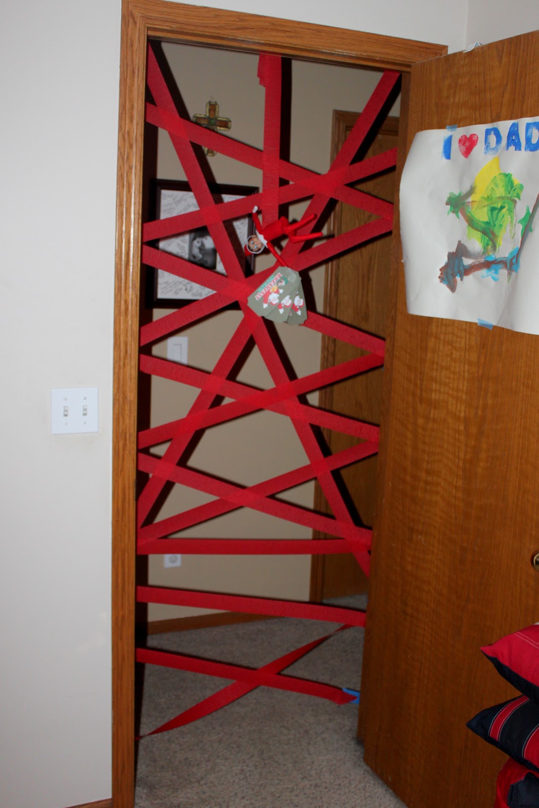 This morning Zach got quite the surprise when he tried to go downstairs to find Elfie. Elfie had taped up streamers to the door closing it off. He was hanging down with tickets for us to have breakfast with Santa. Zach felt like a superhero busting through the paper "saving" us!