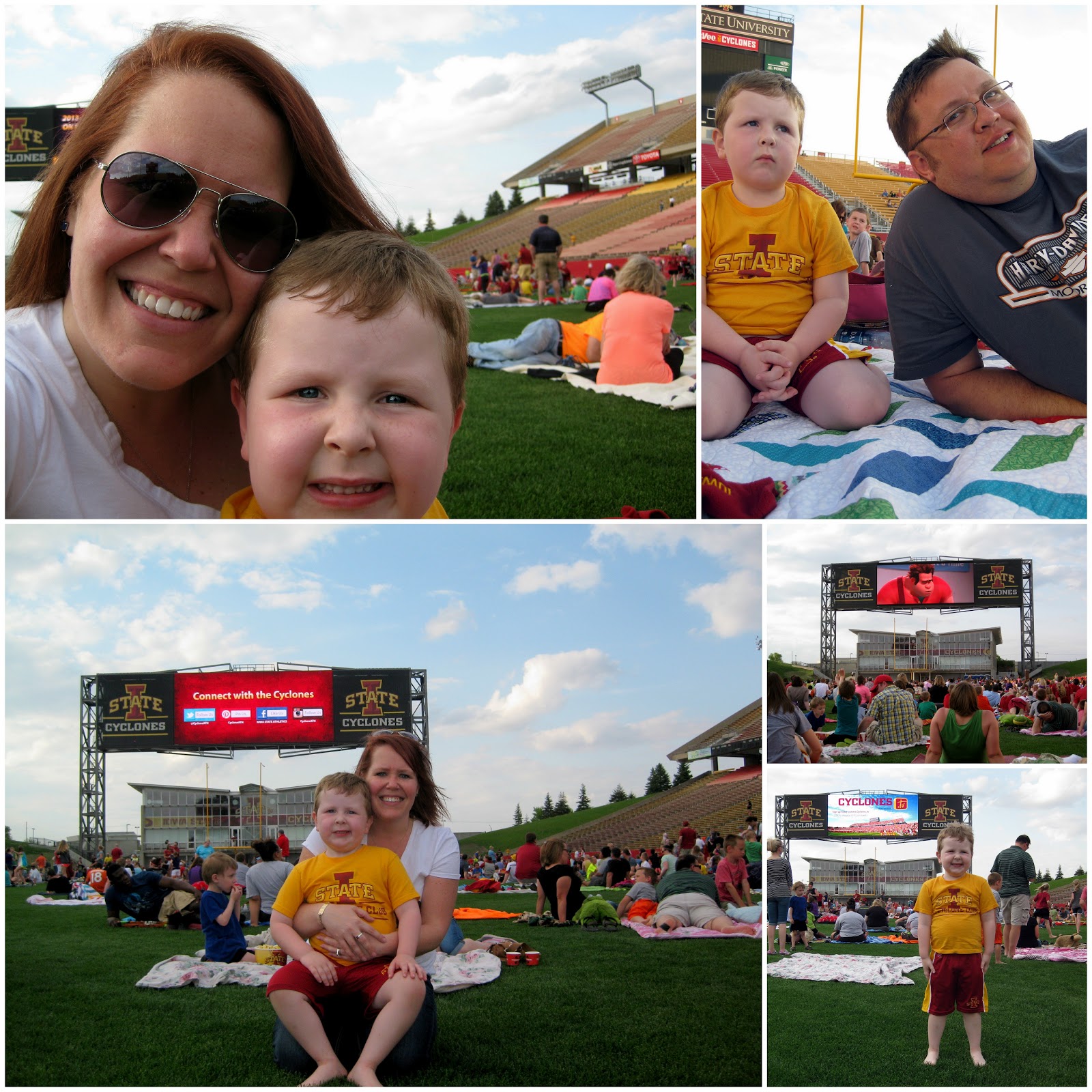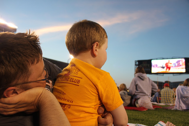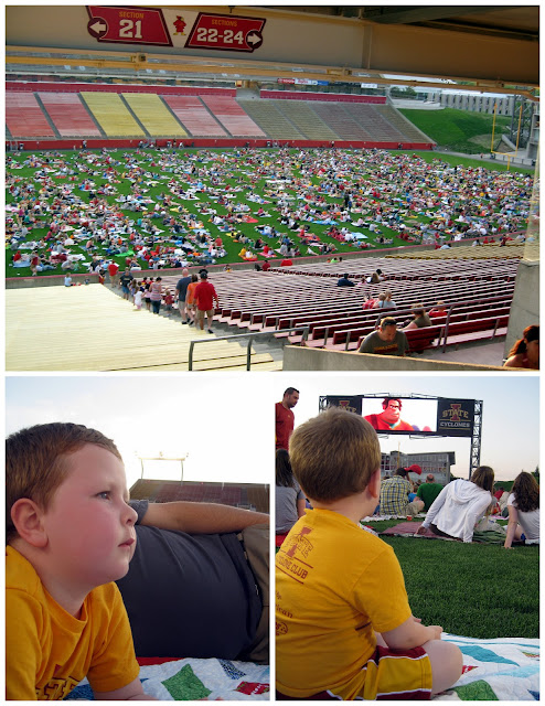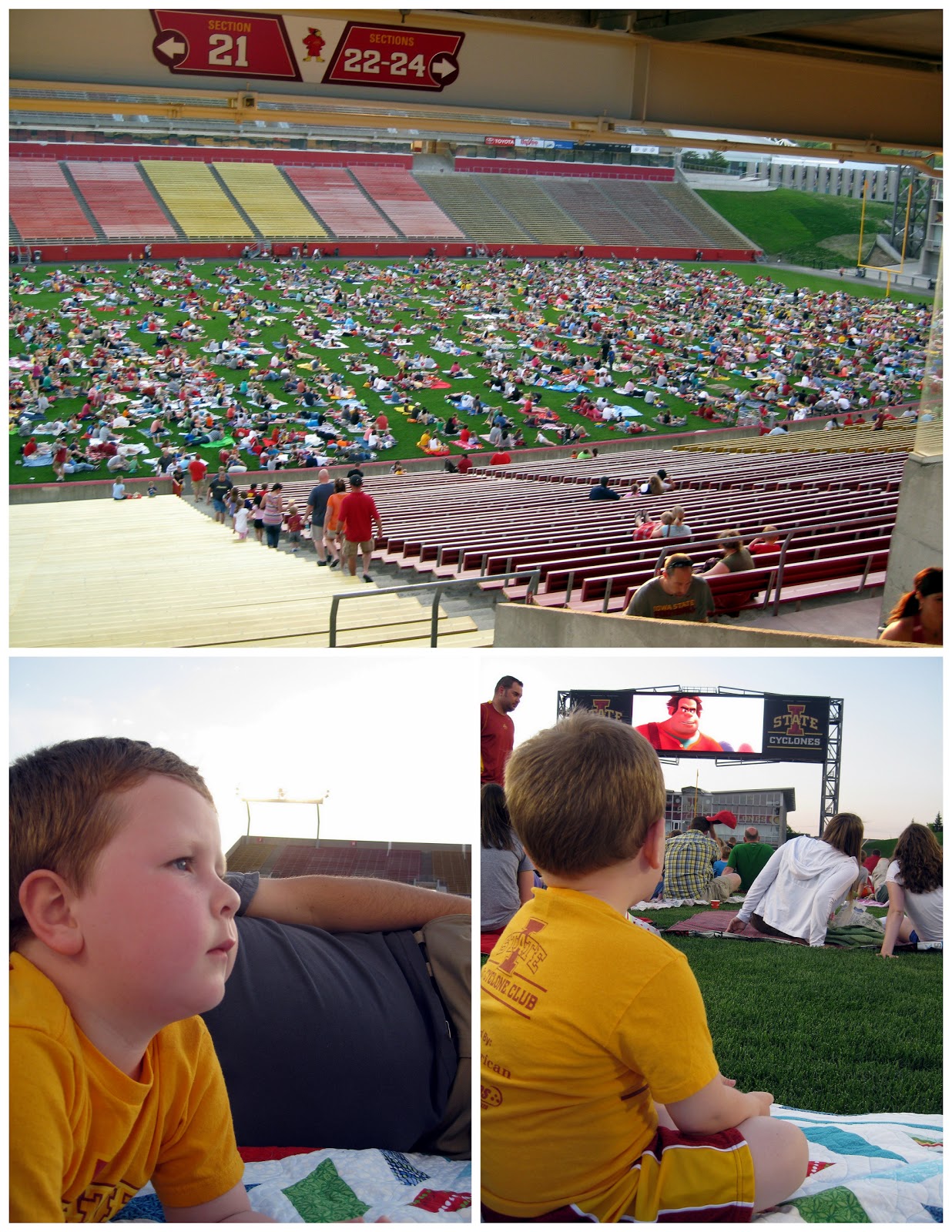 Saturday was a busy day for our family. I got up early and went to the Farmer's Market with my mom. Zach had his last Wee Ball game. We visited a new park in Altoona, and we finished the night off by watching Wreck it Ralph at Jack Trice stadium in Ames. It was awesome to be on the field under the lights with hundreds of other families. I love a family fun day!