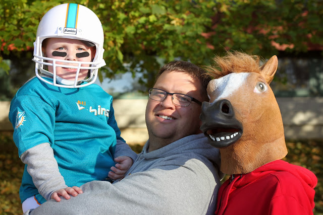 Sunday was a beautiful Fall day. In the morning, Chris worked in the garage while I raked leaves and Zach rode his bike. Tony ordered a horse mask for Halloween and it finally came this weekend. He has been wearing it non-stop much to Zach's delight...and much to our annoyance! In the afternoon we headed out to a pumpkin patch to soak up some more sun!