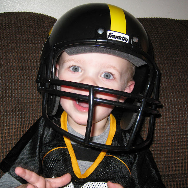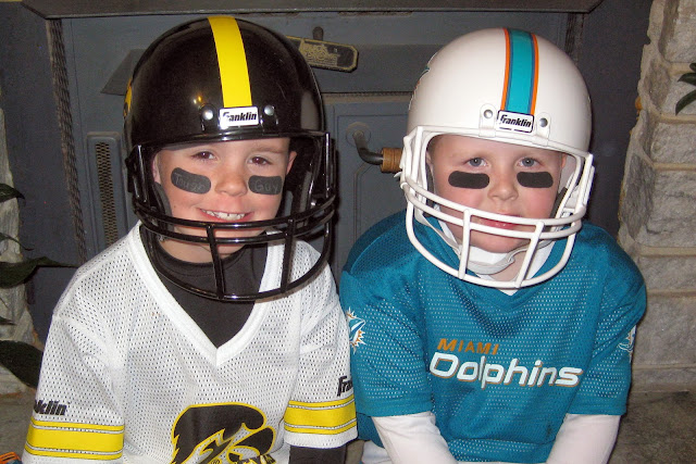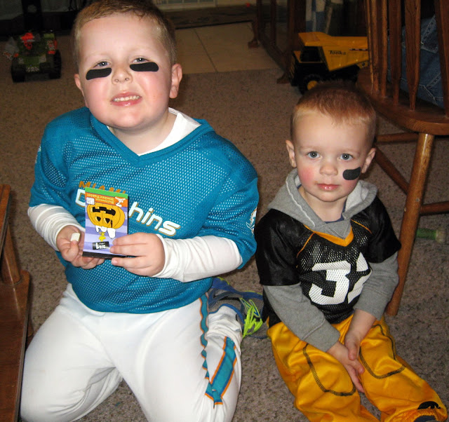 Monday night we trick-or-treated with Noah & Memphis at Grandma & Papa Palmer's house for candy, toys, & pizza. All 3 boys were very handsome (and tough!) football players.