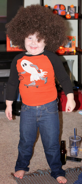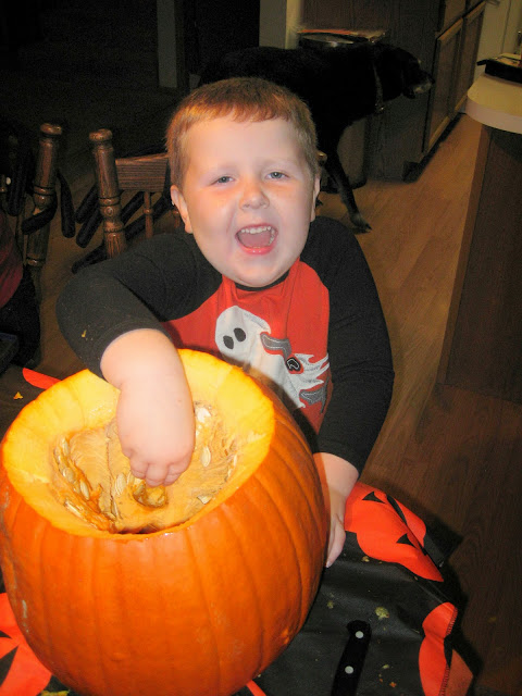 Saturday night was the Huntrod Annual Jack-Off (Jack-o-lantern carve-off). Kyle & Amber came dressed as Bob Ross & a Painted Tree. Mimi & Papa were Cyclone Fred & Wilma Flintstone. The carving started off pretty rough. Zach is fighting a lung infection and couldn't deal with Kyle teasing him with pumpkin guts. He got so worked up the poor kid puked in the gut bucket. After a few deep breaths he was back and ready to carve. He LOVED using the drill and really got into once I cleaned out the pumpkins. It's always an adventure with our family!