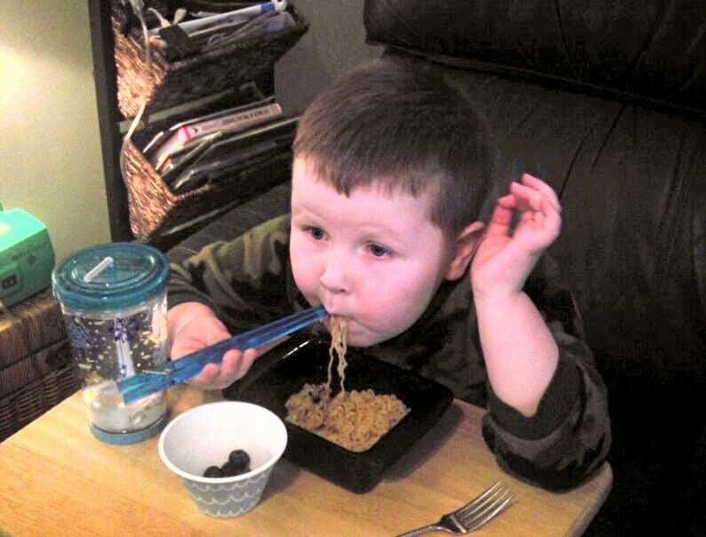 Not much cuter than a little guy eating Chinese noodles with cheater chop-sticks! (Please notice the blueberries in the bowl to try to balance out the unhealthy noodles!)